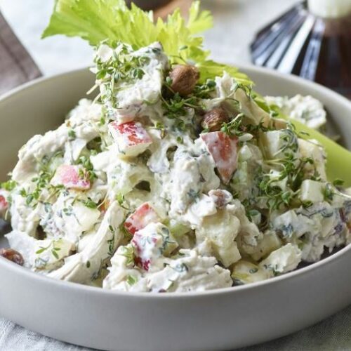- Brug hønsesalaten som forret, server den på en tallerken med salat eller ananasringe,